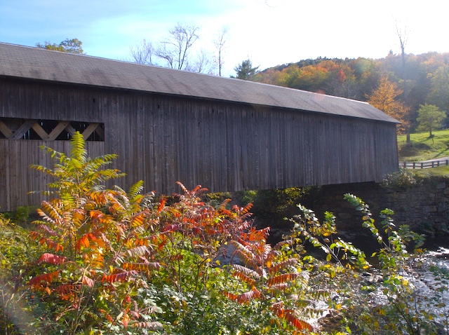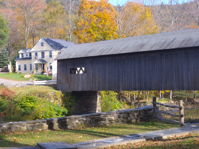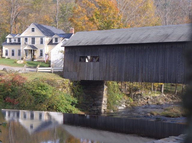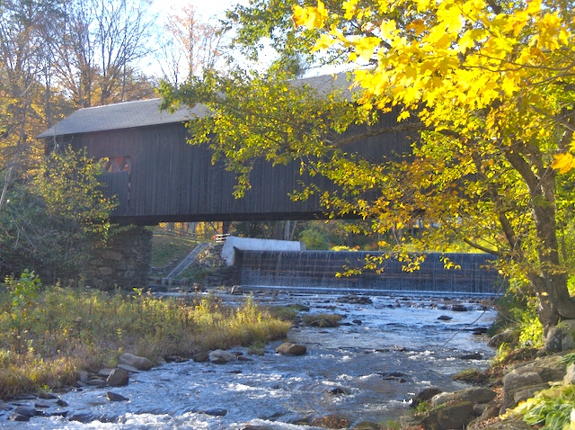 A setting guaranteed to please even the most jaded Vermont visitor is the Green River, about 20 minutes from Brattleboro, in the extreme southeast corner of the Green Mountain State. The area is accessed by a winding country road from nearby Guilford. The Green River setting grabs you from the moment you crest a little hill and look down on the covered bridge and the Green River Bridge House right next to it. Across the road, perched on a small hill, is the former Methodist Episcopal Church with its classic white steeple. Next to the covered bridge, water thunders over a restored timber crib dam.